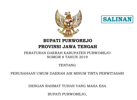 Bupati Purworejo : Peraturan Daerah Nomor 8 Tahun 2019 tentang Perusahaan Umum Daerah Tirta Perwitasari